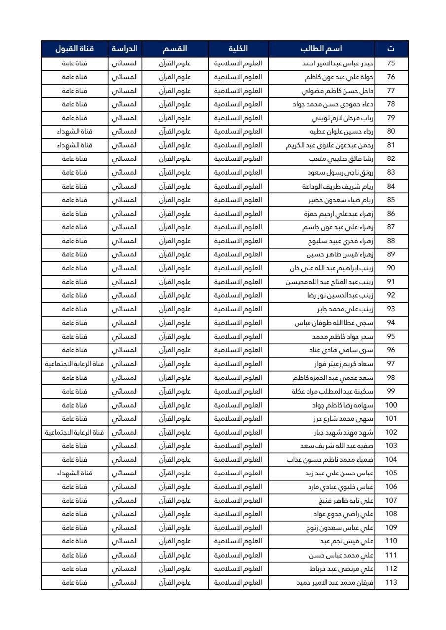 اسماء الطلبة المقبولين في كلية العلوم الاسلامية قسم علوم القرآن للعام 2024-2025
