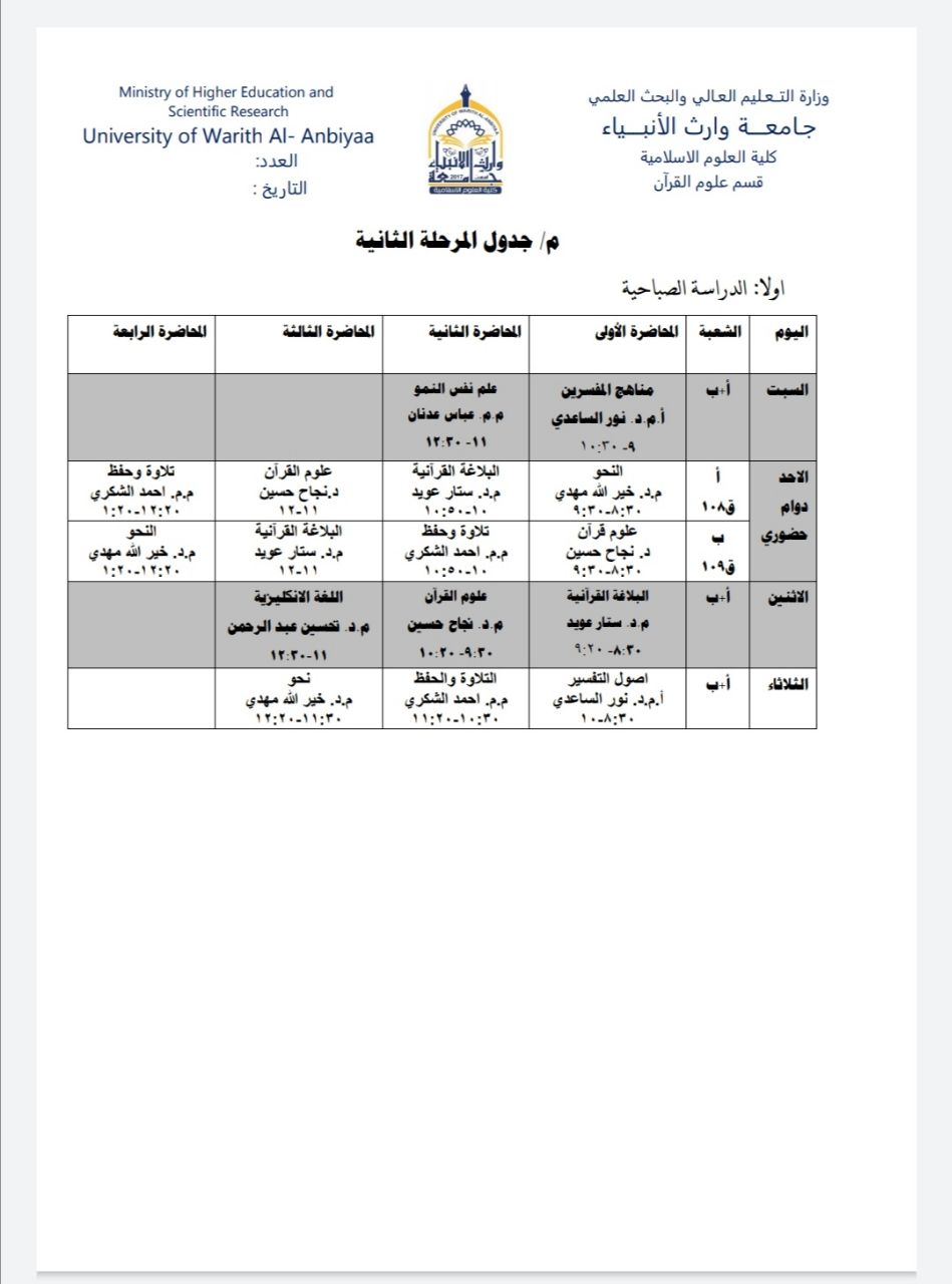 جدول الدروس اليومي للمرحلة الثانية / الدراسة الصباحية والمسائية / قسم علوم القرآن