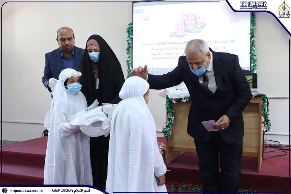 بمناسبة ولادة الصديقة الطاهرة فاطمة الزهراء (عليها السلام) احتضنت جامعة وارث الانبياء(عليه السلام) احتفالاً لمؤسسة (القليل خير من الحرمان الخيرية) لتكليف مجموعة من الايتام الذين بلغوا سن التكليف الشرعي ، حيث استقبل السيد رئيس الجامعة الاستاذ الدكتور طالب حسن موسى الاعزاء الايتام وتبادل الحديث معهن وحثهن على الالتزام بتعاليم الدين والاقتداء بالسيدة فاطمة الزهراء (عليها السلام) ، من جانبه عبر الشيخ محمد الركابي ممثل مؤسسة القليل خير من الحرمان الخيرية عن شكره وتقديره للقائمين على الجامعة لاستقبالهم للسنة الثانية لحفل تكليف السن الشرعي ودعمهم لهذه الشريحة المهمة والمظلومة في المجتمع .