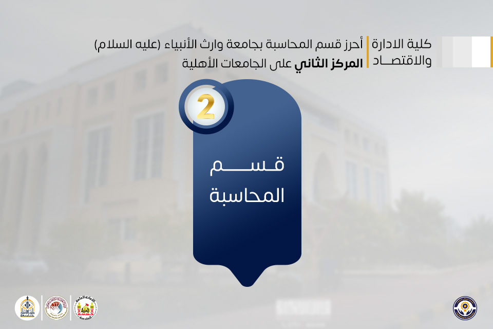 كما حقق قسم المحاسبة في كلية الإدارة والاقتصاد المركز الثاني على مستوى الجامعات الأهلية، والمرتبة الثامنة حكوميًا، بما يعكس كفاءة المخرجات التعليمية ودورها في دعم الاقتصاد وبناء مؤسسات مالية فاعلة، بما ينسجم مع الهدف الثامن (العمل اللائق والنمو الاقتصادي) والهدف التاسع (الصناعة والابتكار والبنى التحتية).