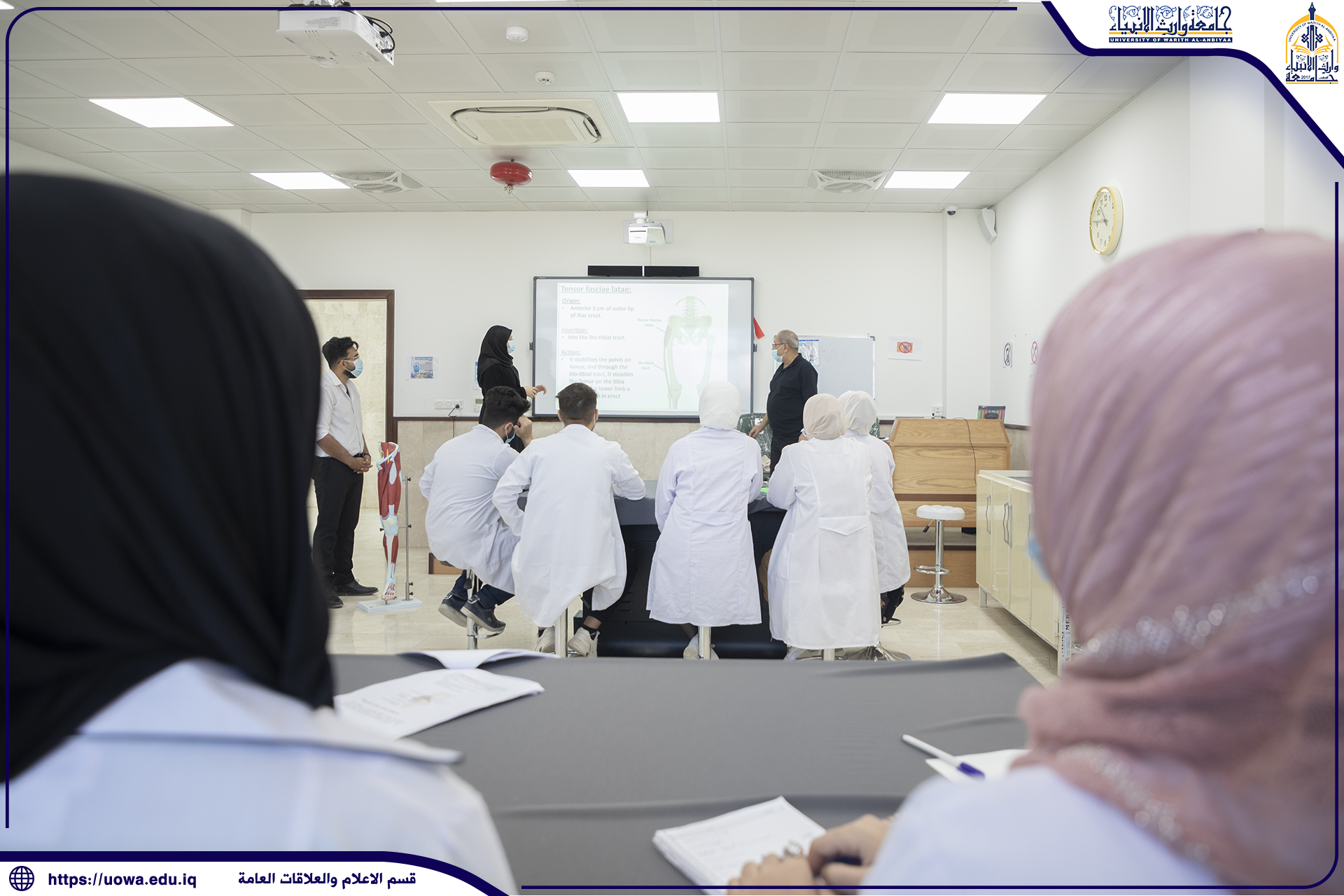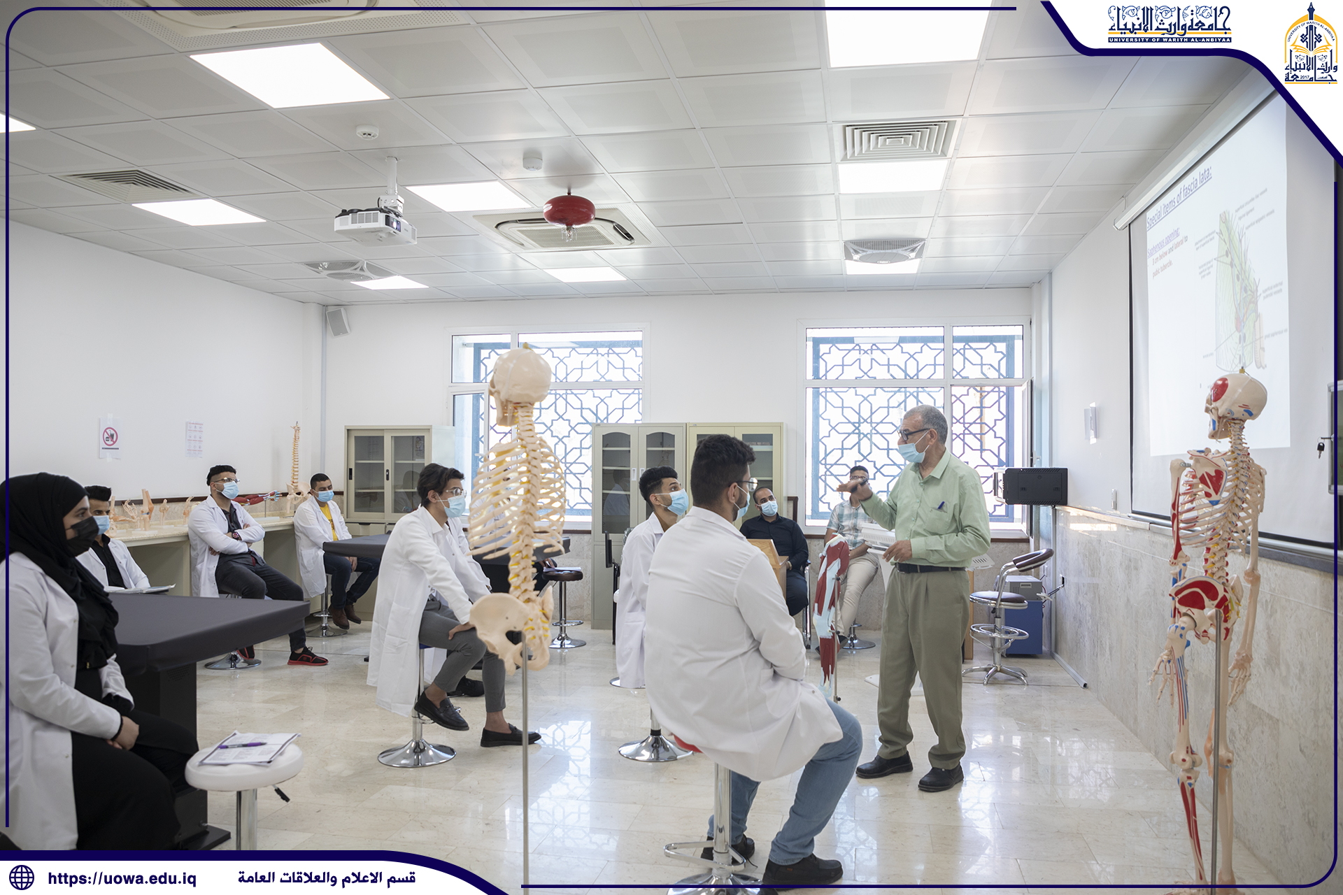طلبة كلية الطب في جامعة وارث الأنبياء(عليه السلام) يتلقون محاضراتهم في المختبرات العلمية ، وأداء بعض التجارب الطبية المختبرية بإشراف مباشر من قبل عميد الكلية الأستاذ الدكتور فالح البياتي والسادة اعضاء هيئة التدريس ، حيث حرصت رئاسة الجامعة على توفير افضل المعدات والاجهزة المختبرية الحديثة للتدريس العملي في الكلية، مع التأكيد على الإلتزام بالاجراءات الوقائية الصحية وارتداء الكمامات للوقاية من عدوى الجائحة.