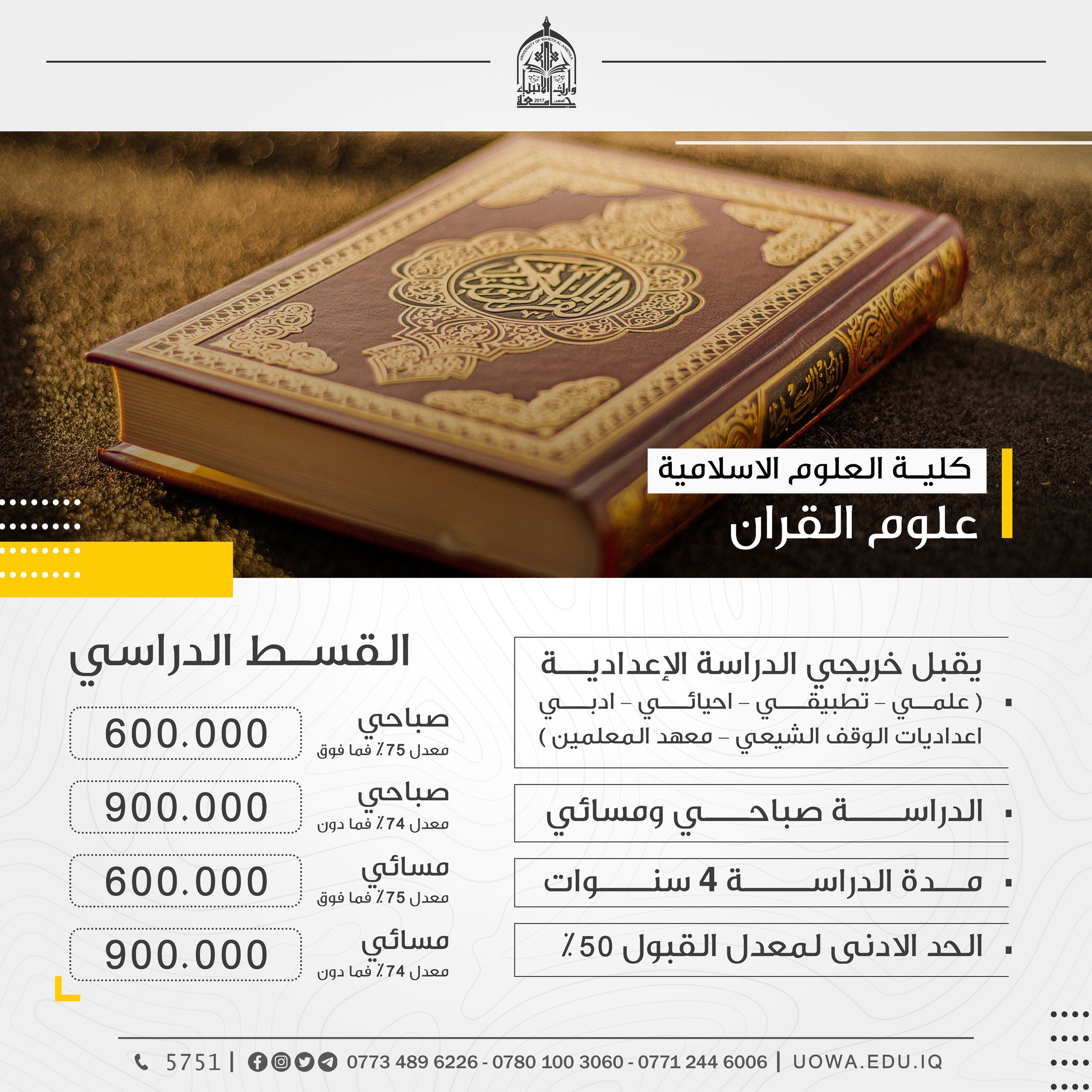 سارعوا بالتسجيل لكي لاتفوتوا فرصة الدراسة الاكاديمية في كليات واقسام جامعة وارث الانبياء(عليه السلام)