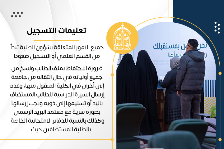 • اطلاع الطلبة على الضوابط والتعليمات والتوجيهات من خلال الاعلان في لوحة الاعلانات وفي أكثر من موقع في الكلية
