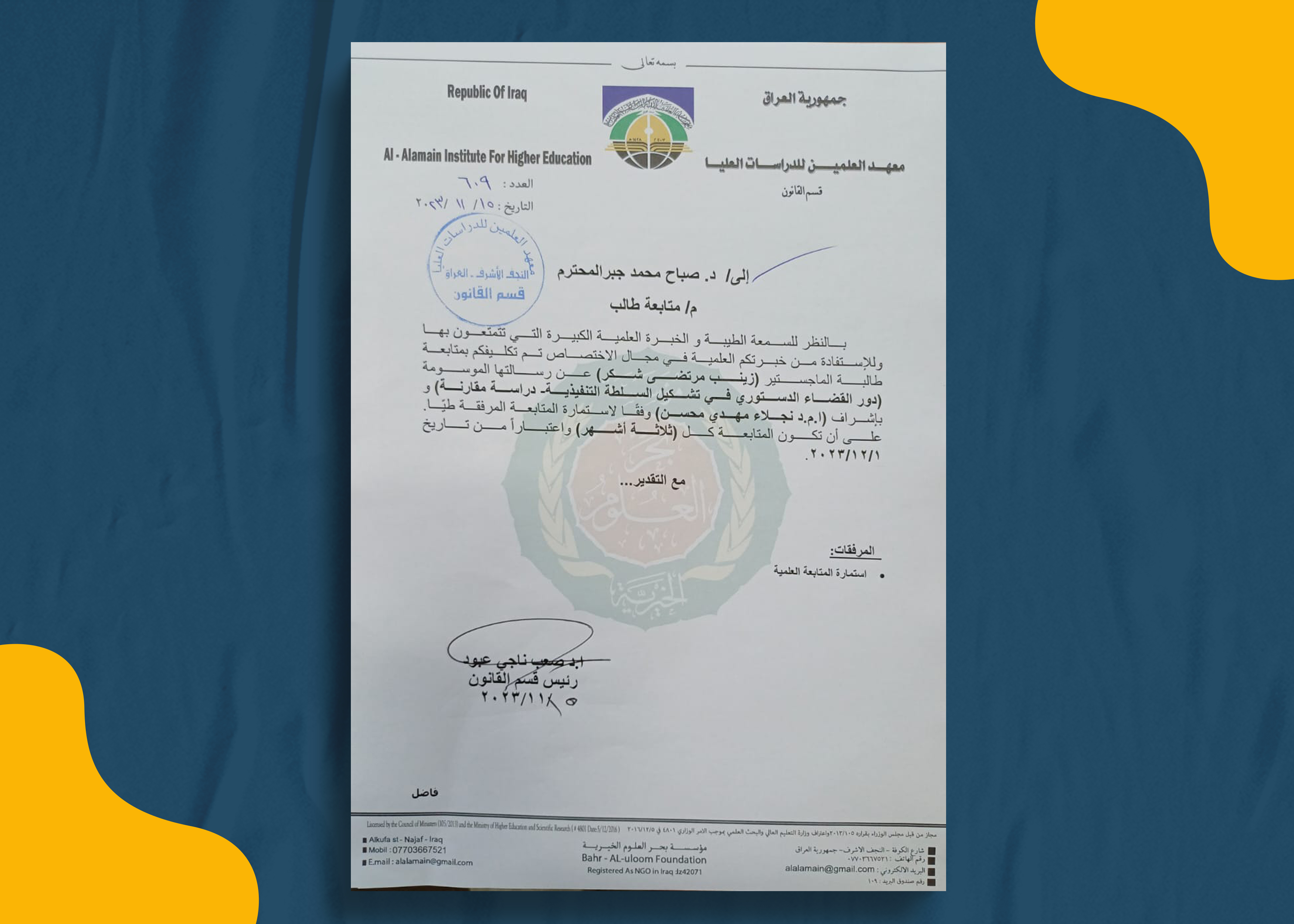 أختير الدكتور صباح محمد جبر- تدريسي في كلية القانون بجامعة وارث الانبياء (عليه السلام) للإشراف على رساله الماجستير الموسومه (دور القضاء الدستوري في تشكيل السلطه التنفيذيه- دراسة مقارنه)، للطالبة زينب مرتضى شكر.