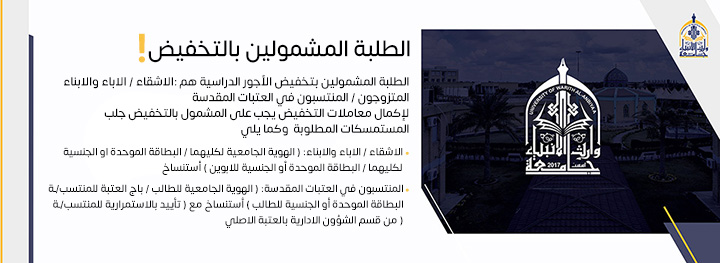الطلبة المشمولين بتخفيض الأجور الدراسية هم (الاشقاء / الاباء والابناء / المتزوجون / المنتسبون في العتبات المقدسة)