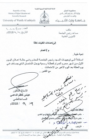 في حالة وجود عطلة رسمية يوم الثلاثاء الموافق 11/9/2018سيكون امتحان مادة الرياضيات لقسم المحاسبة في يوم الاربعاء الموافق 12/9/2018وامتحان مادة مبادئ الاقتصاد(2) لقسم ادارة الاعمال في يوم السبت الموافق 15/9/2018يرجى الانتباه لذلك