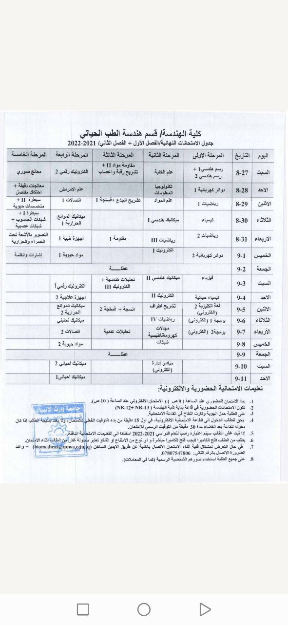 جدول الامتحانات النهائية لقسم هندسة الطب الحياتي للعام الدراسي 2021-2022 الفصل الدراسي الثاني
