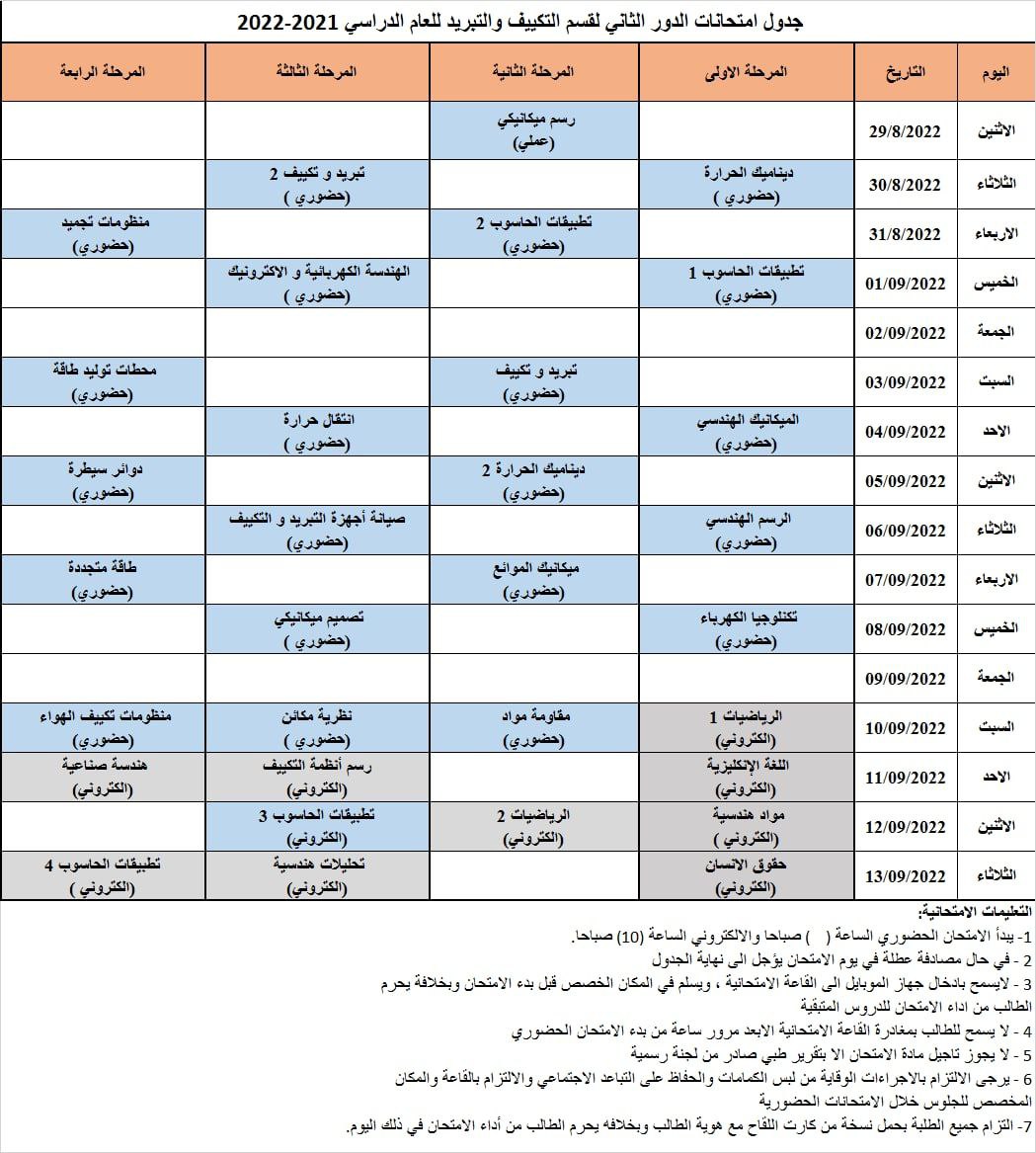 جدول الامتحانات النهائية لقسم هندسة تقنيات التكييف و التبريد للعام الدراسي 2021-2022 الفصل الدراسي الثاني و للدراستين الصباحية والمسائية