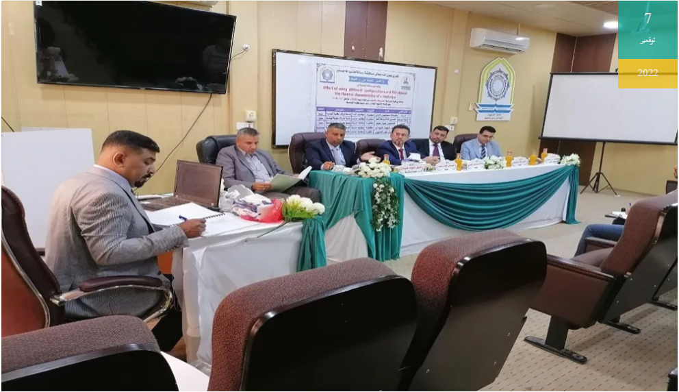 شارك الاستاذ المساعد الدكتور حسن طالب هاشم في مناقشة رسالة ماجستير لباحث من جامعة كربلاء والموسومة (تأثير استخدام التكوينات المختلفة ونسب التعبئة على الخصائص الحرارية لأنبوب الحرارة) هدفت الرسالة الى بناء منصة اختبار للأنابيب الحرارية, التحقيق التجريبي في تأثير ظروف التشغيل ومعلمات التصميم على أداء الأنبوب الحراري المقترح وإجراء تحليل القياسات التجريبية للحصول على المعلمات التي تصف الأداء الحراري للأنبوب الحراري.