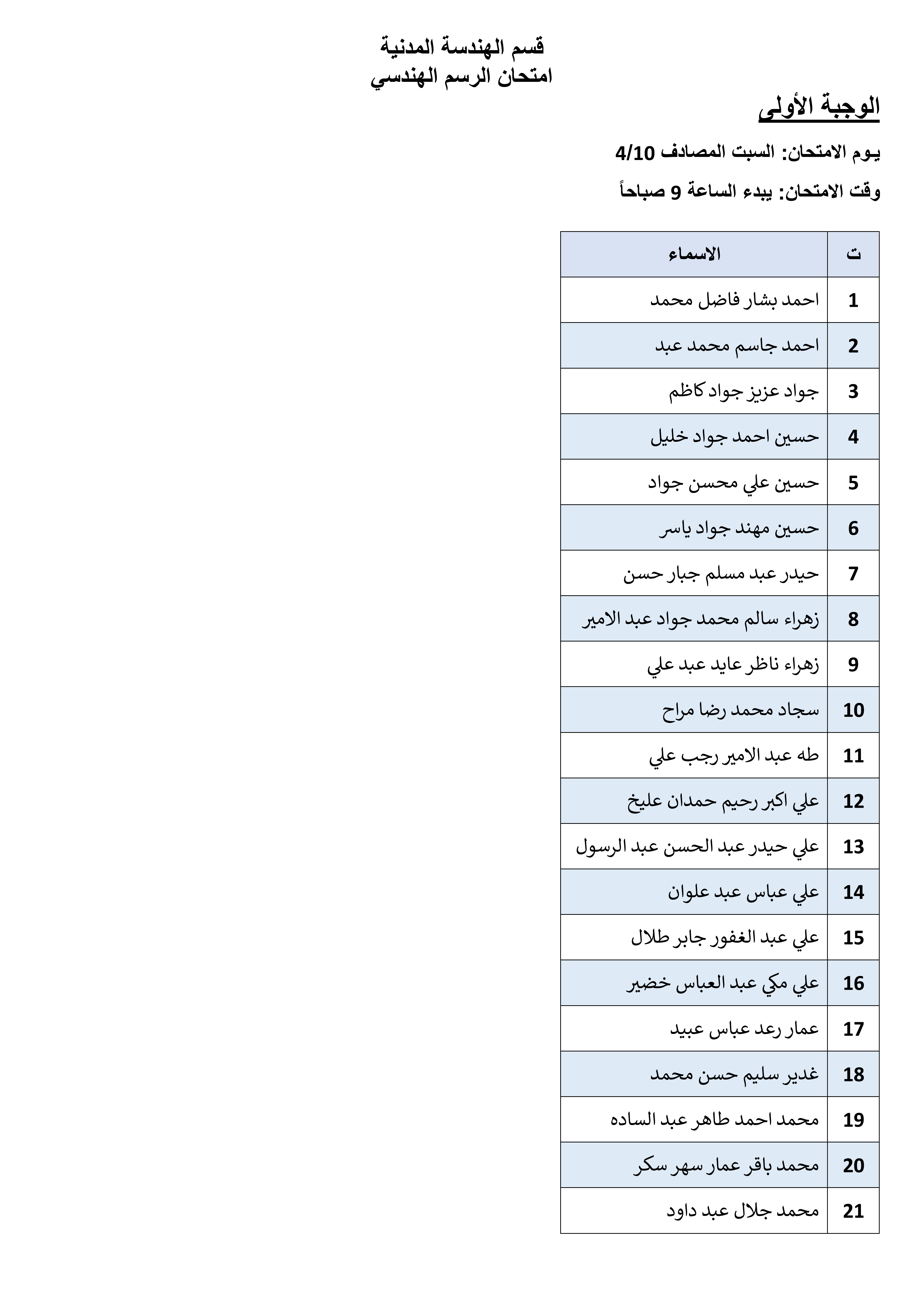 اسماء طلبة المرحلة الاولى في قسم الهندسة المدنية الخاصة بأمتحان الرسم الهندسي