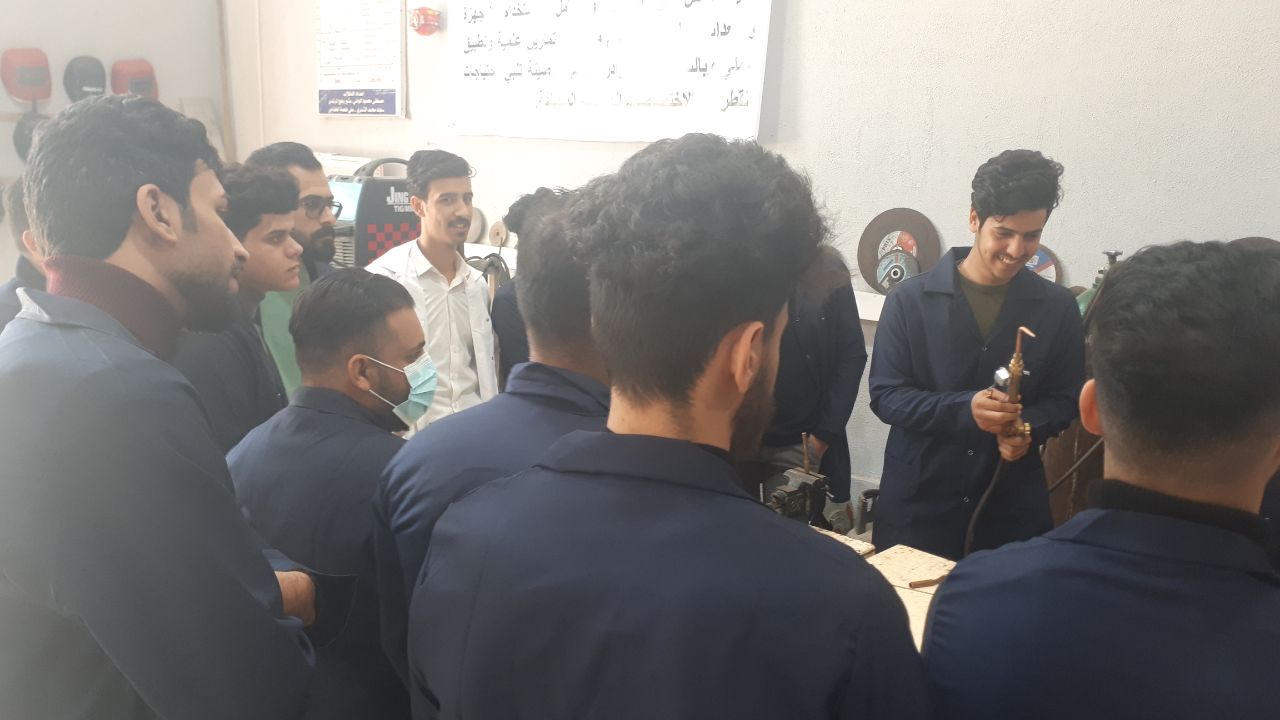 جانب من المحاضرات العملية لورشة اللحام لطلبة قسم هندسة تقنيات التكييف والتبريد حيث تدرب الطلبة على أجراء اللحام الغازي باستخدام غازي الاوكسي استلين والمستخدم في التطبيقات الصناعية لمجال التكييف والتبريد.