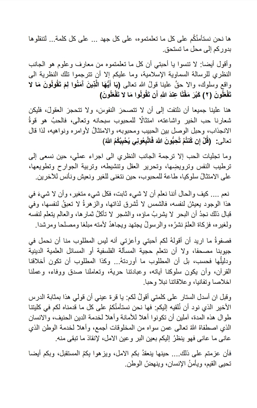 ولأني كلفت بإلقاء كلمةِ الجامعاتِ المشاركةِ وهي كلٌّ من جامعةِ المستنصريةِ والكوفة، والمثنى وميسانَ والقادسيةِ وواسطِ وكربلاءَ وبابلَ، جامعةِ الامامِ الكاظمِ فضلا عن جامعاتٍ أهليةٍ وهي كلٌّ من واهلِ البيتِ والكفيلِ ووارثِ الانبياء أقول: إننا في رئاساتِ الجامعات وعماداتها نثمنُ جهدَ قسم الشؤون الإسلامية والإنسانية ونكبرُ مسعى إداراة القسمِ وشعبِه ومراكزِه لما ابدوه من جهدٍ ليس بقليلٍ في إنجاحِ هذا النشاطِ، والذي كان مآلُهُ فوزَ جامعةِ وارثِ الأنبياء بالمرتبةِ الأولى وجامعةِ الكفيل بالمرتبة الثانية وكليةِ الإمام الكاظم بالمرتبة الثالثة،