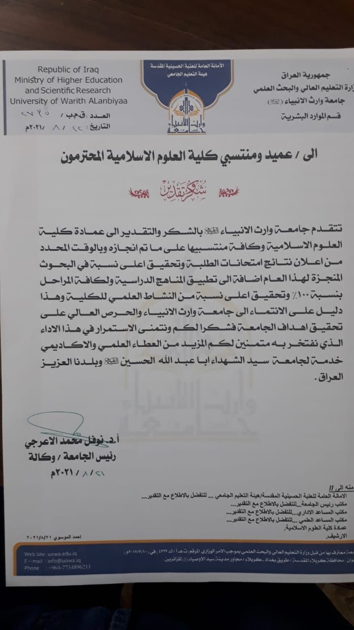 تتقدم جامعة وارث الأنبياء بكتاب شكر وتقدير إلى عمادة كلية العلوم الاسلامية ومنتسبيها على إنجازات الكلية للعام الدراسي ٢٠٢٠ / ٢٠٢١