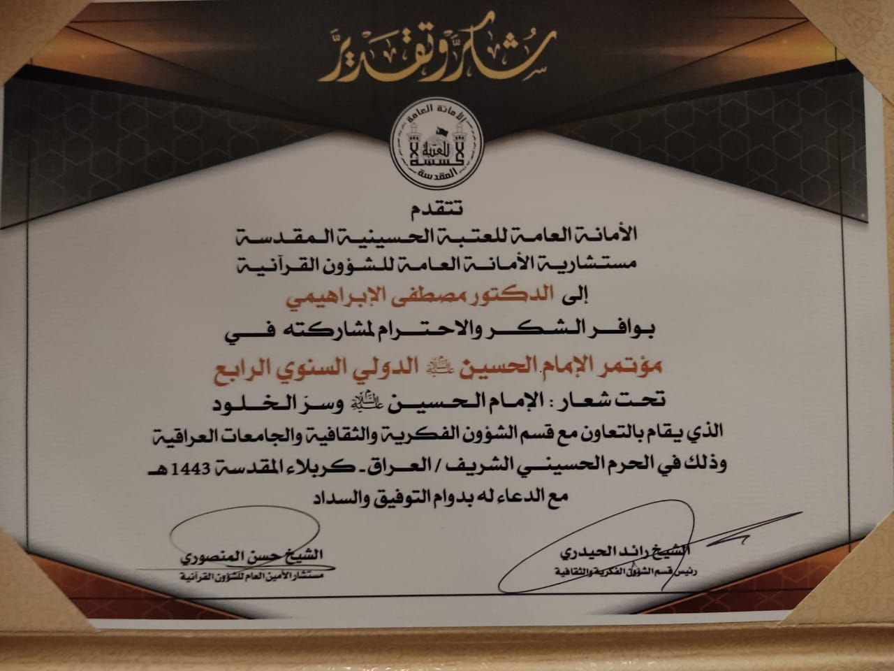 تتقدم مستشارية الأمانة العامة للشؤون القرآنية / العتبة الحسينية المقدسة بوافر شكرها وتقديرها إلى جامعة وارث الأنبياء / كلية العلوم الإسلامية المتمثلة باساتيذها الأجلاء لمشاركتهم الفاعلة في مؤتمر( الإمام الحسين عليه السلام) الذي أقامته العتبة الحسينية المقدسة بالتعاون مع قسم الشؤون الفكرية والثقافية والجامعات العراقية في الحرم الحسيني المقدس