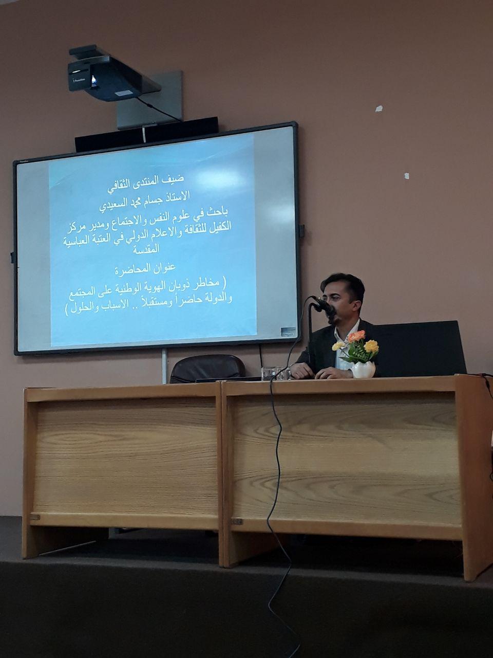 القى الاستاذ جسام محمد السعيدي باحث في علوم النفس والاجتماع ومدير مركز الكفيل للثقافة والاعلام في العتبة العباسية المقدسة محاضرته الموسومة ( مخاطر ذوبان الهوية الوطنية على المجتمع والدولة حاضراً ومستقبلاً .. الاسباب والحلول) في المنتدى الثقافي الاسبوعي المقام برعاية كلية العلوم الاسلامية / جامعة وارث الانبياء يوم الاثنين الموافق 8/4/2019 تناول فيها كيفية الحفاظ على الهوية الوطنية من التيارات الدخيلة وخشية انطماسها .
