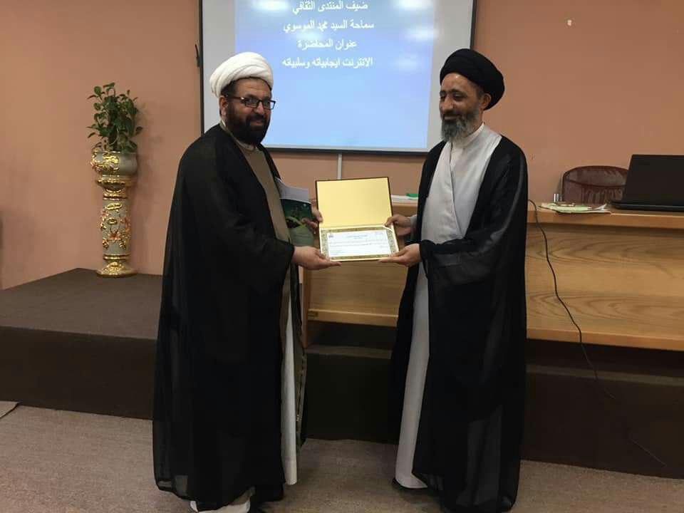 اختتم المنتدى الثقافي المقام برعاية كلية العلوم الاسلامية بمحاضرة سماحة السيد محمد الموسوي الموسومة بـ (الانترنيت ايجابياته وسلبياته ) اوضح فيها اهمية انتشال الطالب من الافكار الهدامة التي تغزو البلد عبر شبكات التواصل الانترنيت بوصفه سلاح ذو حدين ( يمكن الانتفاع منه والاضرار به ) . فتح السيد في محاضرته الباب امام الطلبة لطرح الاسئلة والمناقشة والحوار .