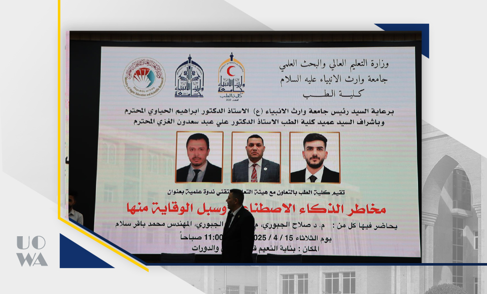 برعاية السيد رئيس جامعة وارث الأنبياء (ع) الأستاذ الدكتور إبراهيم الحياوي المحترم، وبإشراف مباشر من السيد عميد كلية الطب الأستاذ الدكتور علي عبد سعدون الغزي المحترم، أقامت كلية الطب بالتعاون مع هيئة التعليم التقني ندوة علمية حملت عنوان: “مخاطر الذكاء الاصطناعي وسبل الوقاية منها”، وذلك يوم الثلاثاء الموافق 15 / 4 / 2025 في قاعة الورش والدورات – بناية النعيم.