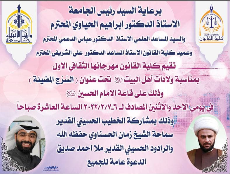 برعاية رئاسة جامعة وارث الأنبياء واشراف عميد كلية القانون، نظمت كلية القانون في الجامعة مهرجانها الثقافي الأول تحت عنوان (السُرج المضيئة) تزامناً مع ذكرى الولادات الميمونة لأهل بيت النبوة (عليهم السلام).