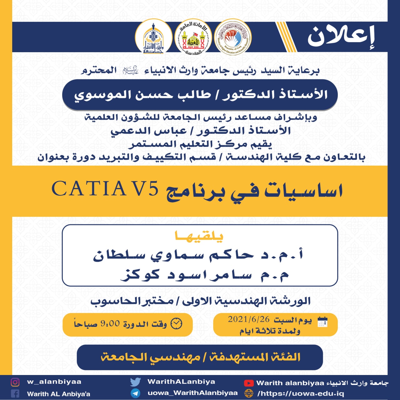 حرصاً من القائمين على جامعة وارث الأنبياء و كُلْيَة الهندسة على تطوير و ضمان جودة المختبرات العلمية شاركت كُلْيَة الهندسة و المتمثلة بكادرها التدريسي في الدورة المقامة من قبل قسم ضمان الجودة و الأداء الجامعي بالتعاون مع قسم التعليم المستمر في جامعة وارث الأنبياء لليوم الأول ليكون الهدف منها تطوير الكوادر التدريسية و الفنية.