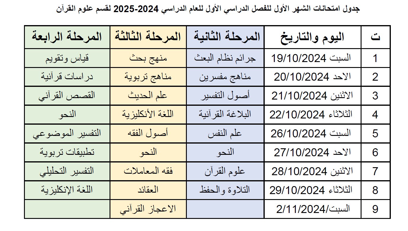 جدول امتحان الشهر الأول لقسم علوم القرآن للعام 2024-2025