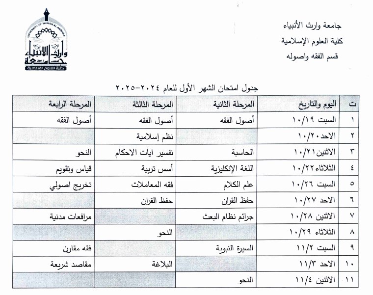 جدول امتحان الشهر الأول لقسم الفقه وأصوله للعام 2024-2025