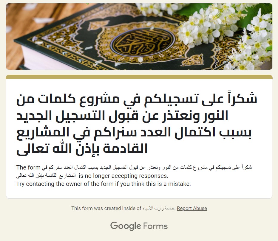 أعلنت كلية العلوم الإسلامية بجامعة وارث الأنبياء يوم السبت 26 اكتوبر 2024 عن اغلاق التسجيل بسبب اكتمال عدد المشاركين في مشروع "كلمات من النور"، حيث تم تسجيل 700 طالب وأستاذ من مختلف الكليات.