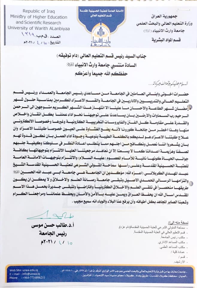 تهنئة السيد رئيس جامعة وارث الانبياء(عليه السلام) الاستاذ الدكتور طالب حسن موسى لتدريسي ومنتسبي الجامعة بمناسبة حلول شهر رمضان المبارك .