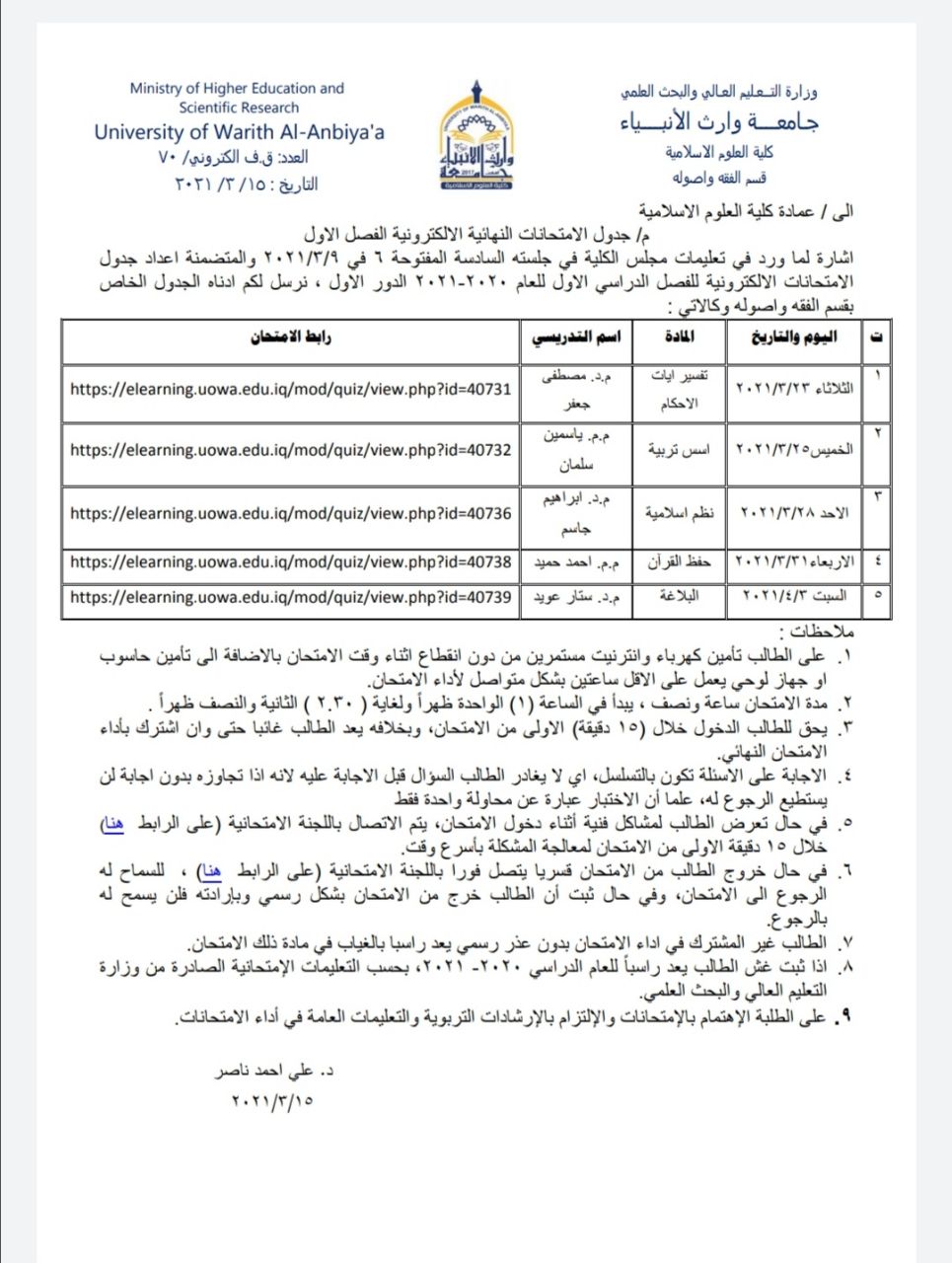 أعلن السيد مساعد رئيس جامعة وارث الأنبياء عليه السلام للشؤون العلمية الأستاذ الدكتور عباس كاظم الدعمي المحترم انطلاق الامتحانات النهائية للفصل الدراسي الأول في الدراسات الأولية للعام الدراسي (2020/ 2021) هذا اليوم السبت الموافق (20/ 3/ 2021).