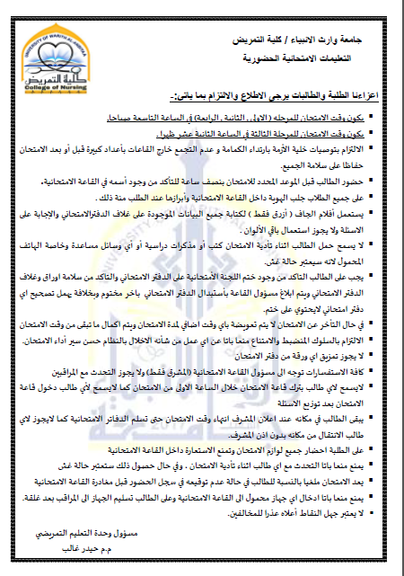 وحدة التعليم التمريضي الجامعي في كلية التمريض تدعو طلبتها الاعزاء للالتزام بالتوجيهات و التعليمات الامتحانية.