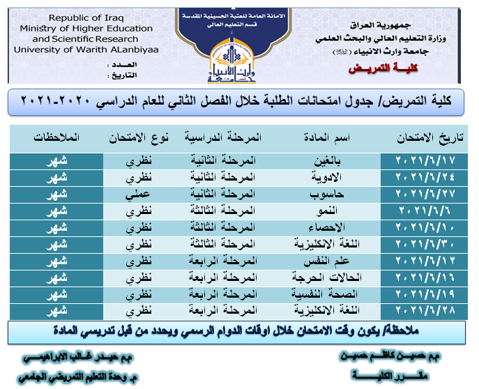 استمرار المحاضرات الالكترونية والحضورية لتدريسي كلية التمريض في جامعة وارث الانبياء ع