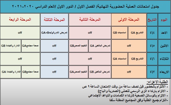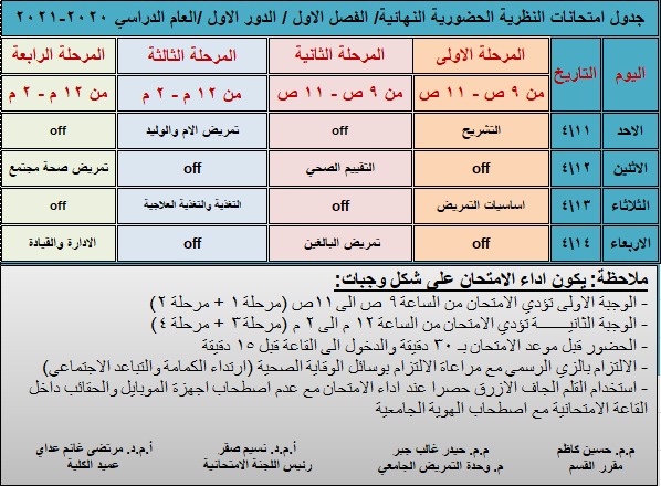 استمرار اختبار الطلبة في اسبوع الامتحانات النهائية العملية للمواد الاساسية في كلية التمريض مع اتخاذ كافة الاجراءات الوقائية اللازمة.
