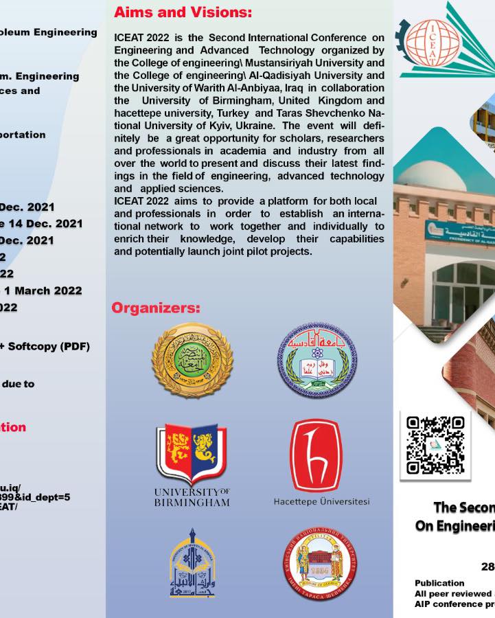 حرصاً على ديمومة التعاون العلمي بين مؤسسات التعليم العالي في العراق ولما تمتلكه الجامعة من قامات علمية وأكاديمية،انضمت جامعة وارث الانبياء(عليه السلام) الى الهيئة التنظيمية للمؤتمر الدولي الثاني للهندسة والتقنيات المتقدمة(ICEAT-2022) ،الذي ستقيمه كلية الهندسة بجامعة القادسية ،وبمشاركة كلية الهندسة بالجامعة المسنتصرية ،إضافة الى جامعات دولية اخرى (جامعة حجة تبه التركية و جامعة برمنكهام البريطانية وجامعة كييف الوطنية)،حيث سيعقد المؤتمر افتراضياً بسبب ضروف الجائحة في العاصمة التركية إسطنبول بتاريخ٢٨ -٢٩ / ٣/ ٢٠٢٢وسيتم نشر كافة البحوث في مجلة AIP المفهرسة ضمن مستوعبات سكوبس.بإمكان السادة الباحثين المشاركة بالمؤتمر ببحوثهم العلمية القيمة عبر الروابط الآتية:رابط المؤتمر‏https://uomustansiriyah.edu.iq/web_page.php?page_id=2899...رابط قناة التلكرام للاجابة على استفسارات الباحثين الاعزاء‏https://t.me/+aEWuEsX8uk8zZjAyرابط المشاركة كمقيم في المؤتمر‏https://surveyheart.com/for