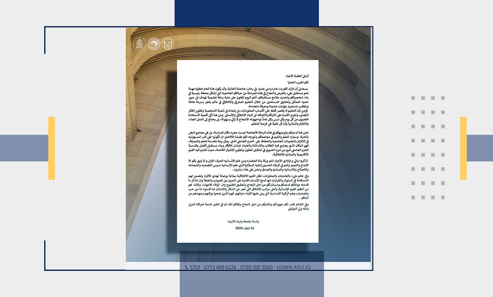 نحن هنا لدعمكم وتوجيهكم في هذه الرحلة فالجامعة ليست مجرد مكان للدراسة، بل هي مجتمع نابض بالحياة وسفراء للعلم والقيم في مجتمعكم ونتوجه لكم طلبتنا الافاضل ان تكونوا على قدر المسؤوليه في الالتزام بالتعليمات الجامعيه والحفاظ على الحرم الجامعي الذي يمثل بيئة مقدسة للعلم والمعرفة، فهو المكان الذي يجتمع فيه الطلاب والأساتذة والعلماء لتبادل الأفكار وبناء مستقبل أفضل وقدسية الحرم الجامعي تنبع من دوره الحيوي في تشكيل العقول وتطوير الأجيال القادمة، حيث تُحترم فيه القيم الأكاديمية والمبادئ الأخلاقية.