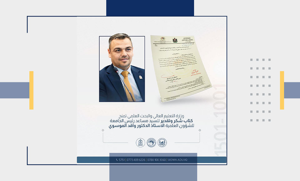 في خطوة تعكس التقدير للجهود الأكاديمية، منح معالي وزير التعليم العالي والبحث العلمي، الدكتور نعيم العبودي، كتاب شكر وتقدير للأستاذ الدكتور واقد الموسوي، مساعد رئيس جامعة وارث الأنبياء (عليه السلام) للشؤون العلمية.
