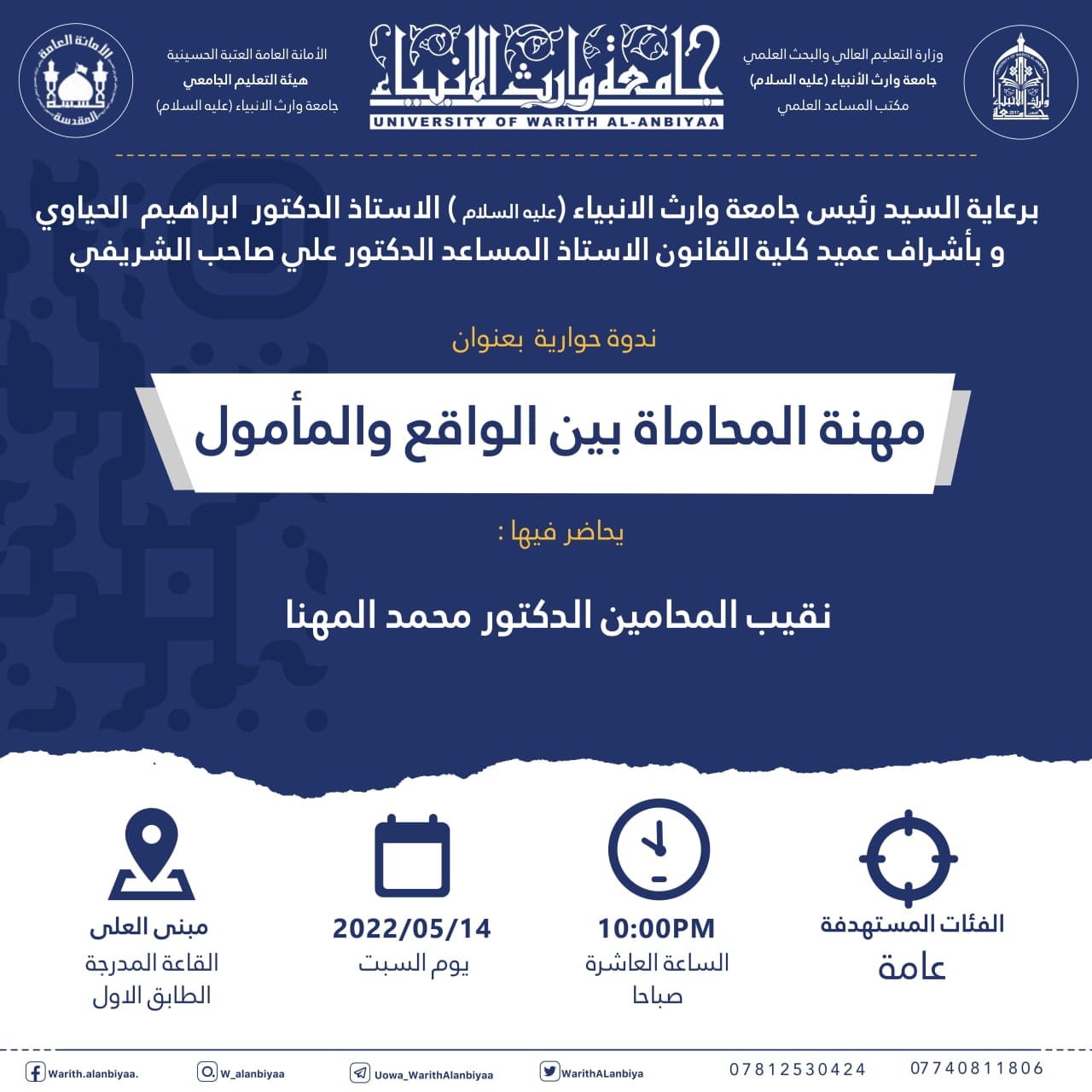 تنظم كلية القانون في الجامعة ندوة حوارية تحت عنوان" مهنة المحاماة بين الواقع والمأمول" يحاضر فيها نقيب المحامين الدكتور محمد المهنا.