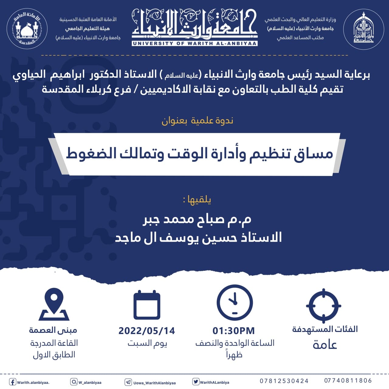 برعاية رئيس الجامعة الاستاذ الدكتور ابراهيم سعيد الحياوي تعقد كلية الطب في الجامعة وبالتعاون مع نقابة الاكاديميين/ فرع كربلاء المقدسة