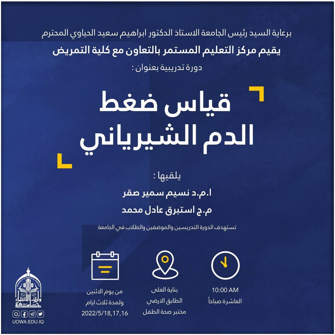 برعاية رئيس الجامعة الاستاذ الدكتور ابراهيم سعيد الحياوي يقيم مركز التعليم المستمر وبالتعاون مع كلية التمريض في الجامعة دورة تدريبية بعنوان "قياس ضغط الدم الشرياني"