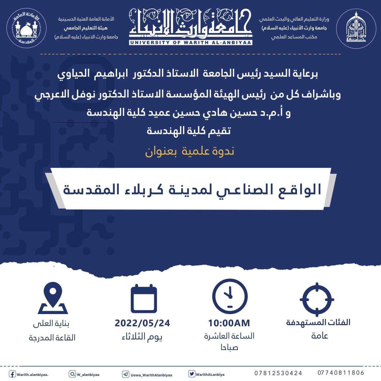 برعاية رئيس الجامعة الأستاذ الدكتور إبراهيم الحياوي، وبإشراف كل من رئيس الهيأة المؤسسة الأستاذ الدكتور نوفل الاعرجي، وعميد كلية الهندسة أ.م.د. حسين هادي حسين أقامت الكلية ندوة علمية بعنوان "الواقع الصناعي لمدينة كربلاء المقدسة"