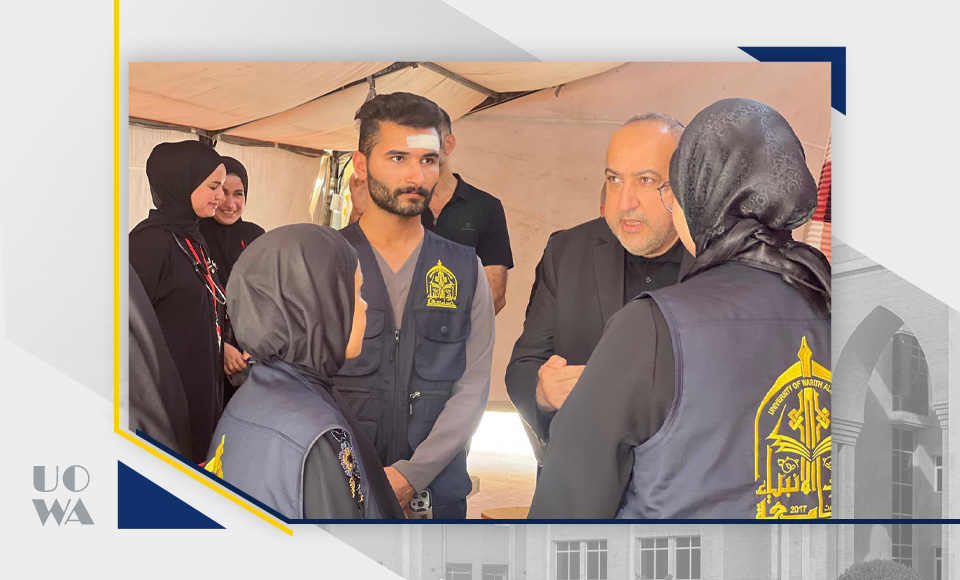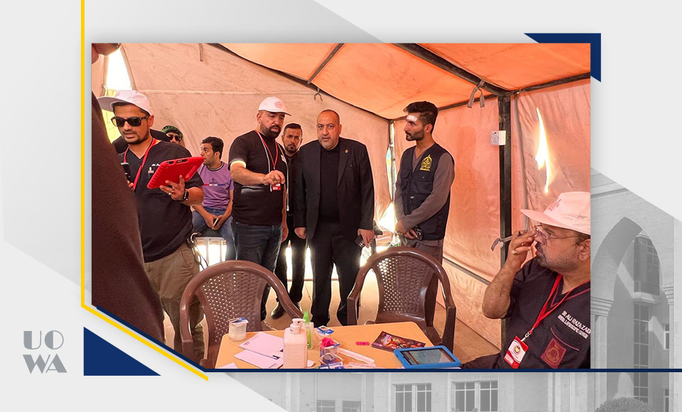 As part of his field supervision of services provided to the pilgrims of Imam Hussein’s (PBUH) Arbaeen, Professor Dr Ibrahim Saeed Al-Hayawi, President of the University of Warith Al-Anbiyaa (PBUH), inspected one of the medical posts operated by the university’s medical students in cooperation with the International Imamiyah Organisation.