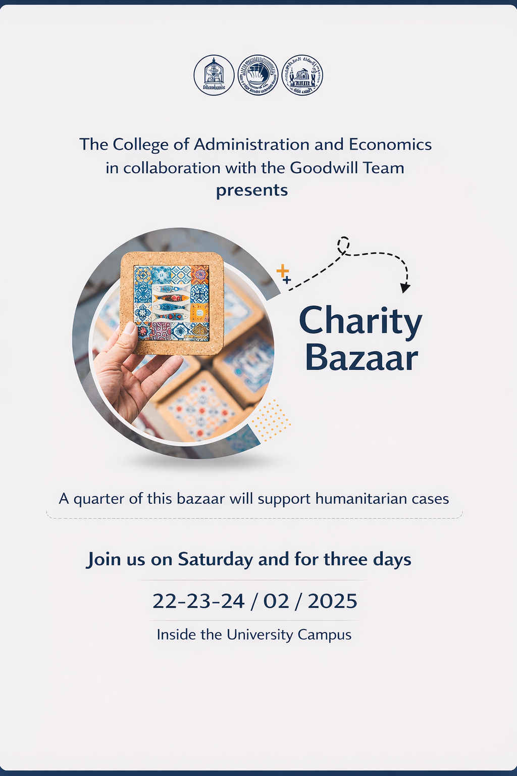 The College of Administration and Economics at the University of Warith Al-Anbiyaa organised a charity bazaar with the participation of a number of students and academic staff. The event aimed to raise donations, with the proceeds dedicated to supporting humanitarian cases and providing assistance to those in need.