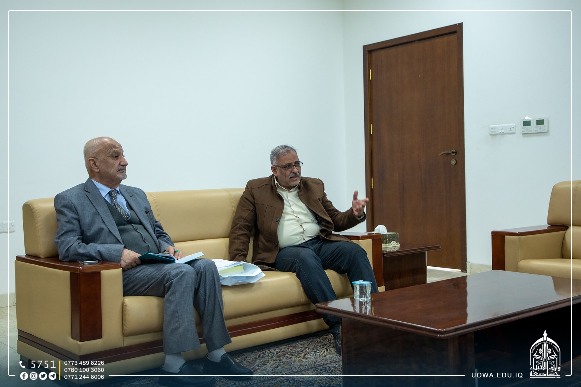 The Presidency of Warith Al-Anbiyaa University represented by Prof. Dr. Nawfal Al-Araji, Assistant President for Administrative Affairs, received a delegation from the Shiite Endowment Office (Department of Shrines in Iraq) headed by Mr. Alaa Al-Qassim, Director General of Shrines. The mechanism of cooperation between the Diwan and the University was discussed through the publication of scientific research, and the establishment of scientific and educational seminars for students.