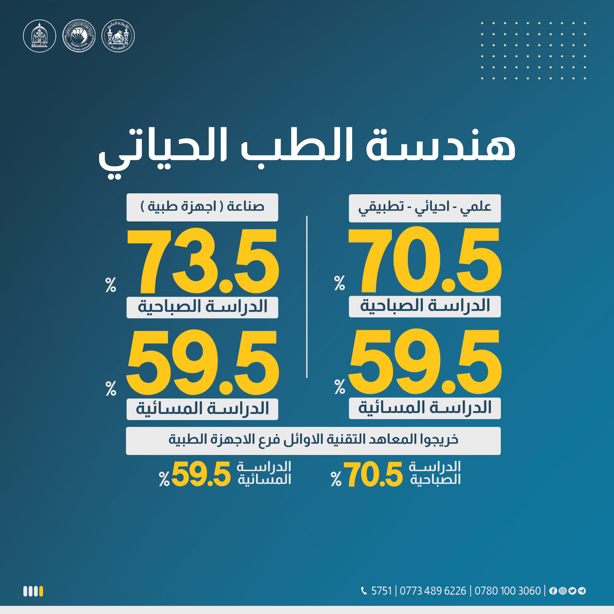 🔸 The minimum admission requirements for both morning and evening sessions for specializations in engineering, engineering technologies, and sciences have been reduced to a current application average of 61, increasing by only one grade.