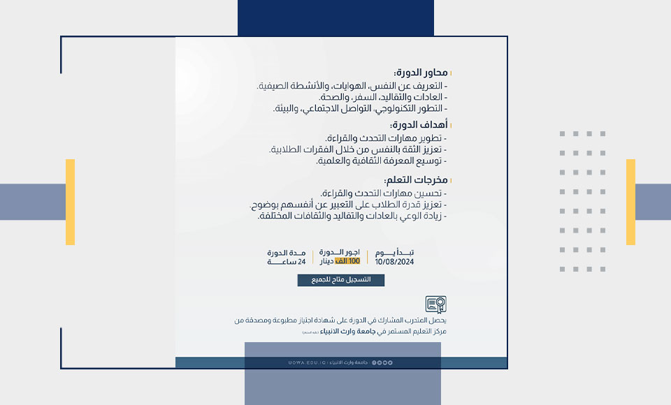 Don't hesitate to join us at the University of Warith Al-Anbiyaa (Baghdad-Karbala Road / Al-Aala Building / Third Floor), and we will be happy to assist you and provide necessary support.