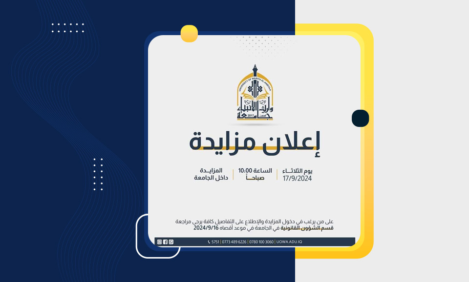 The University of Warith Al-Anbiyaa (PBUH) announced an auction to sell a group of chairs inside the university on Tuesday, September 17, 2024, at exactly 10 am. The university invited those wishing to participate in the auction and view all the details to review the Legal Affairs Department no later than September 16, 2024.