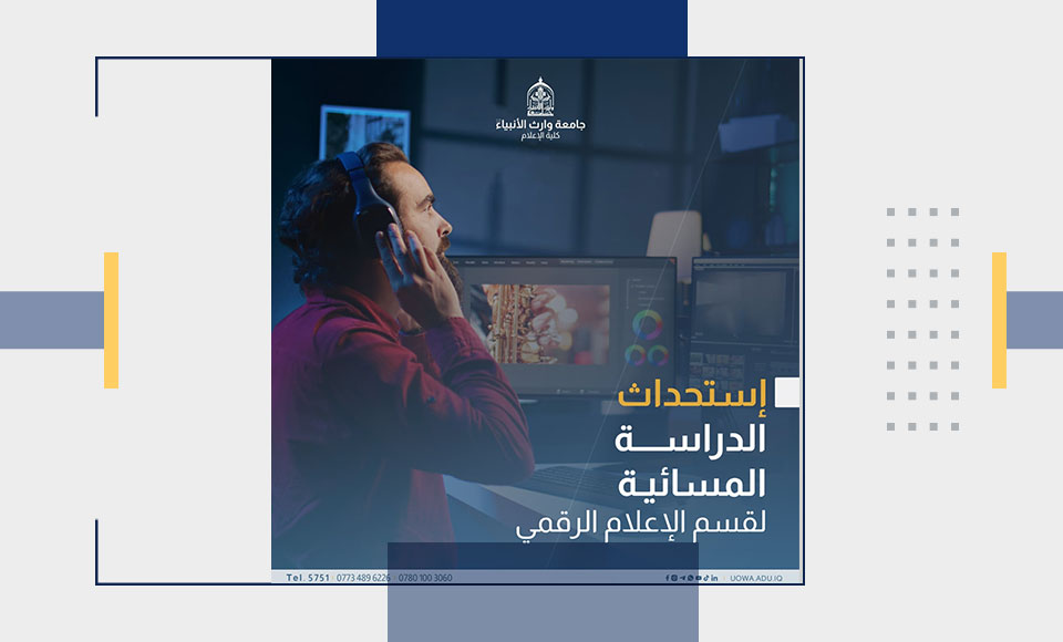 The University of Warith Al-Anbiyaa (PBUH) is pleased to announce the establishment of an evening study program for the Digital Media Department in the College of Media. Applications will open upon the launch of the online application form for universities and private colleges by the Ministry of Higher Education and Scientific Research.