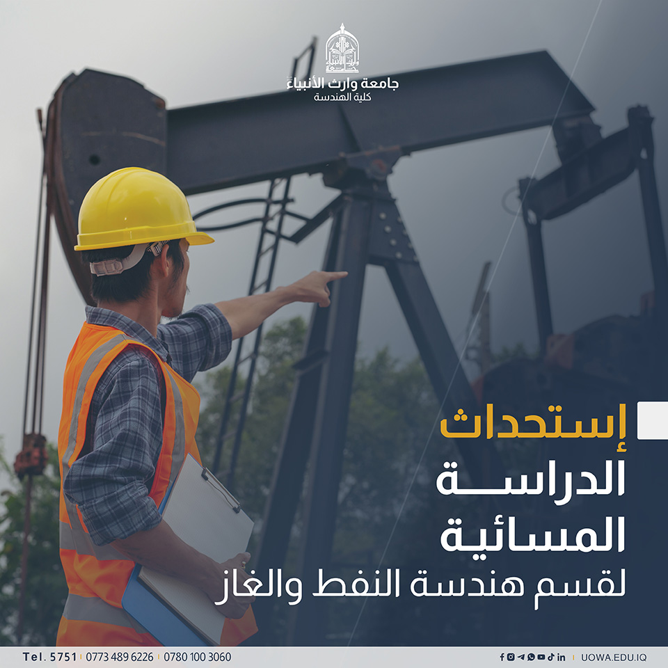 The Department of Oil and Gas Engineering at the College of Engineering at the University of Warith Al-Anbiyaa (PBUH) has announced the launch of an evening study plan. The purpose of this new addition is to give students who want to pursue studies in this important sector more educational alternatives.