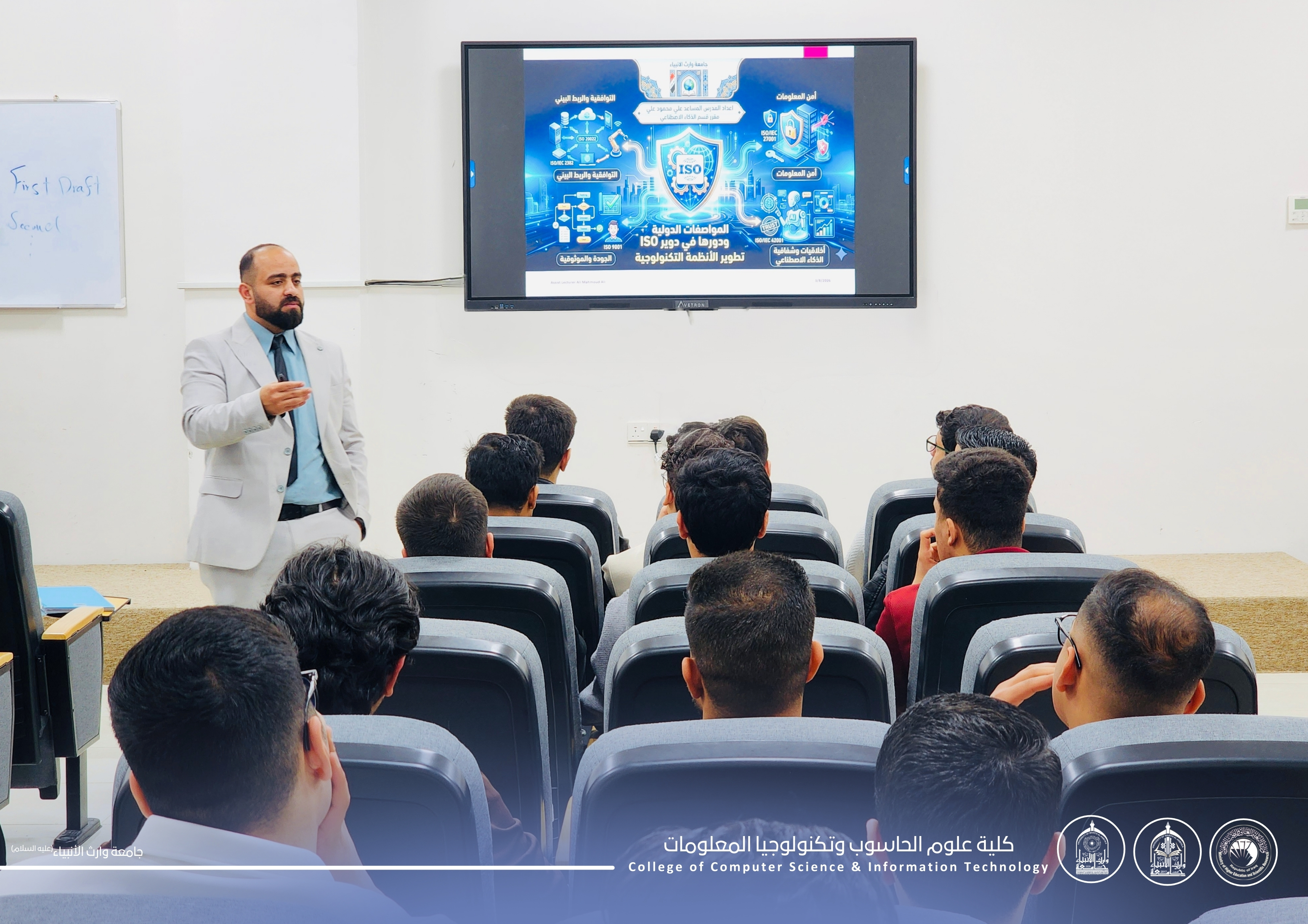 The College of Computer Science and Information Technology / Women’s Affairs Unit at the University of Warith Al-Anbiyaa (peace be upon him) organized a scientific workshop entitled “International ISO Standards and Their Role in Developing Technological Systems” on 10-3-2026. The workshop was delivered by Assistant Lecturer Ali Mahmoud Ali, Rapporteur of the Artificial Intelligence Department.