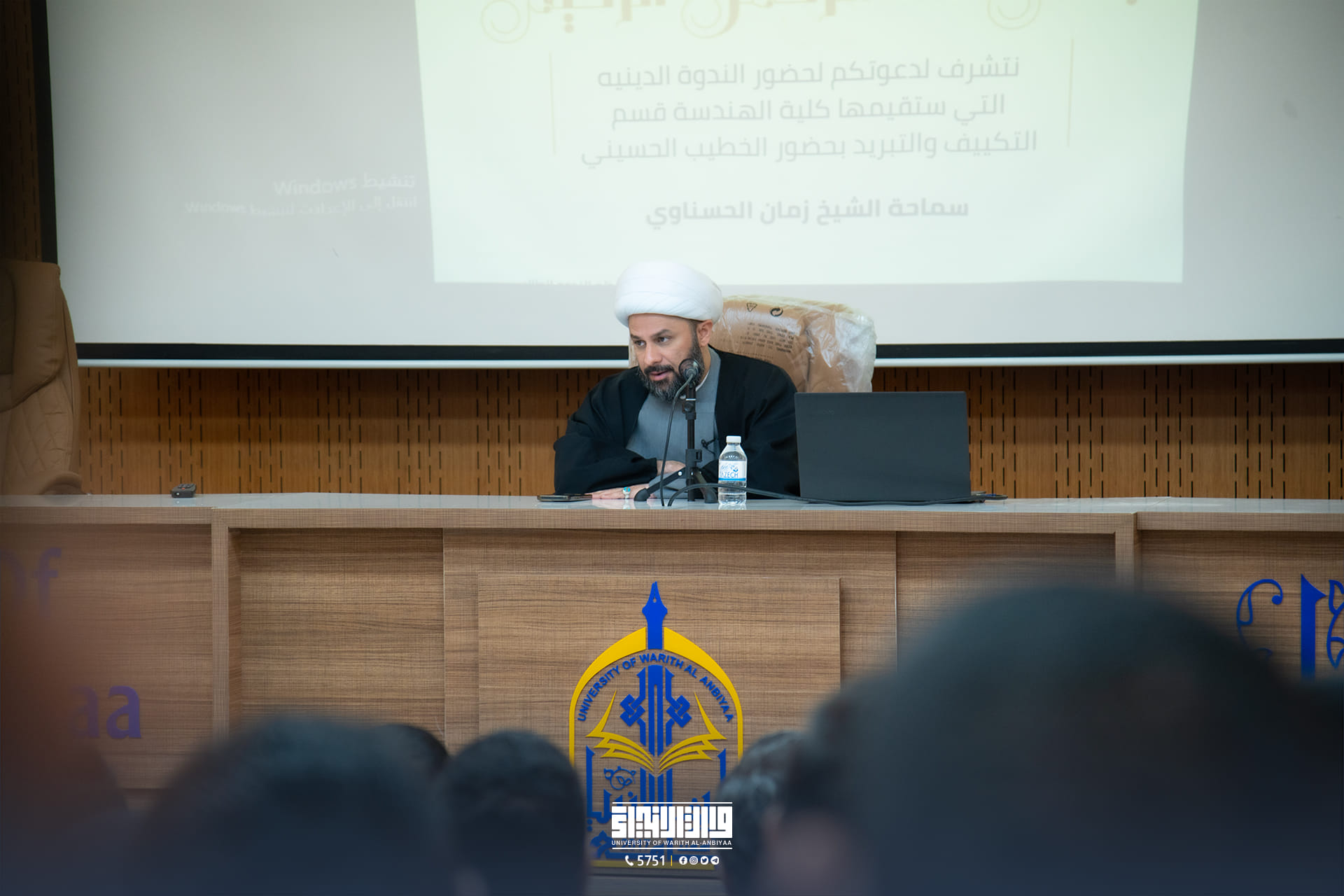 In the distinguished presence of university students, the Deanship of the College of Engineering at the University of Warith Al-Anbiyaa (peace be upon him) hosted the Al-Husseini preacher His Eminence Sheikh Zaman Al-Hasnawi (may his success be long) to present a cultural symposium under the title (The Divine Project in its Seven Stages).