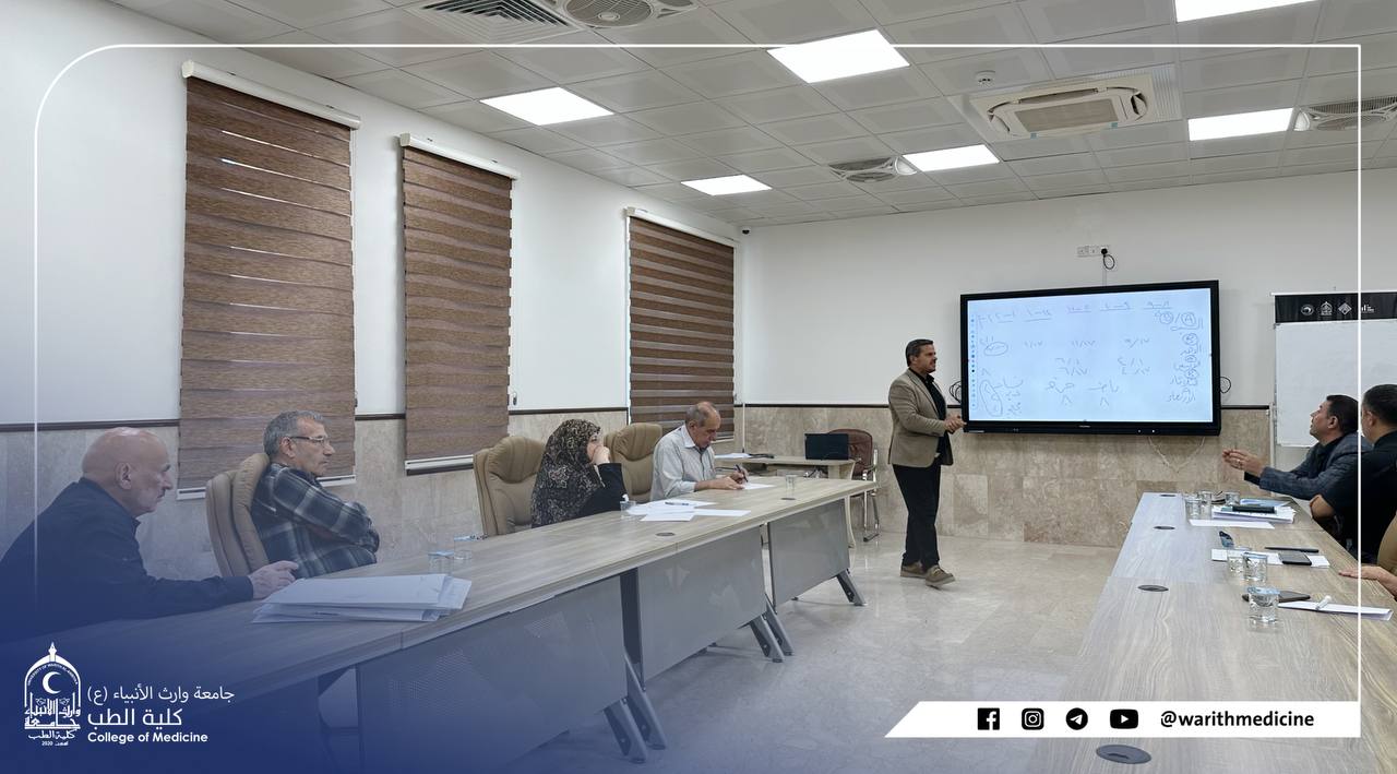 The Council of the Faculty of Medicine, Heir al-Anbiya University (peace be upon him) holds its regular session in the presence of the respected Dean of the Faculty of Medicine, Professor Dr. Ali Abd Saadoun, the distinguished assistants, and the heads of the branches.
