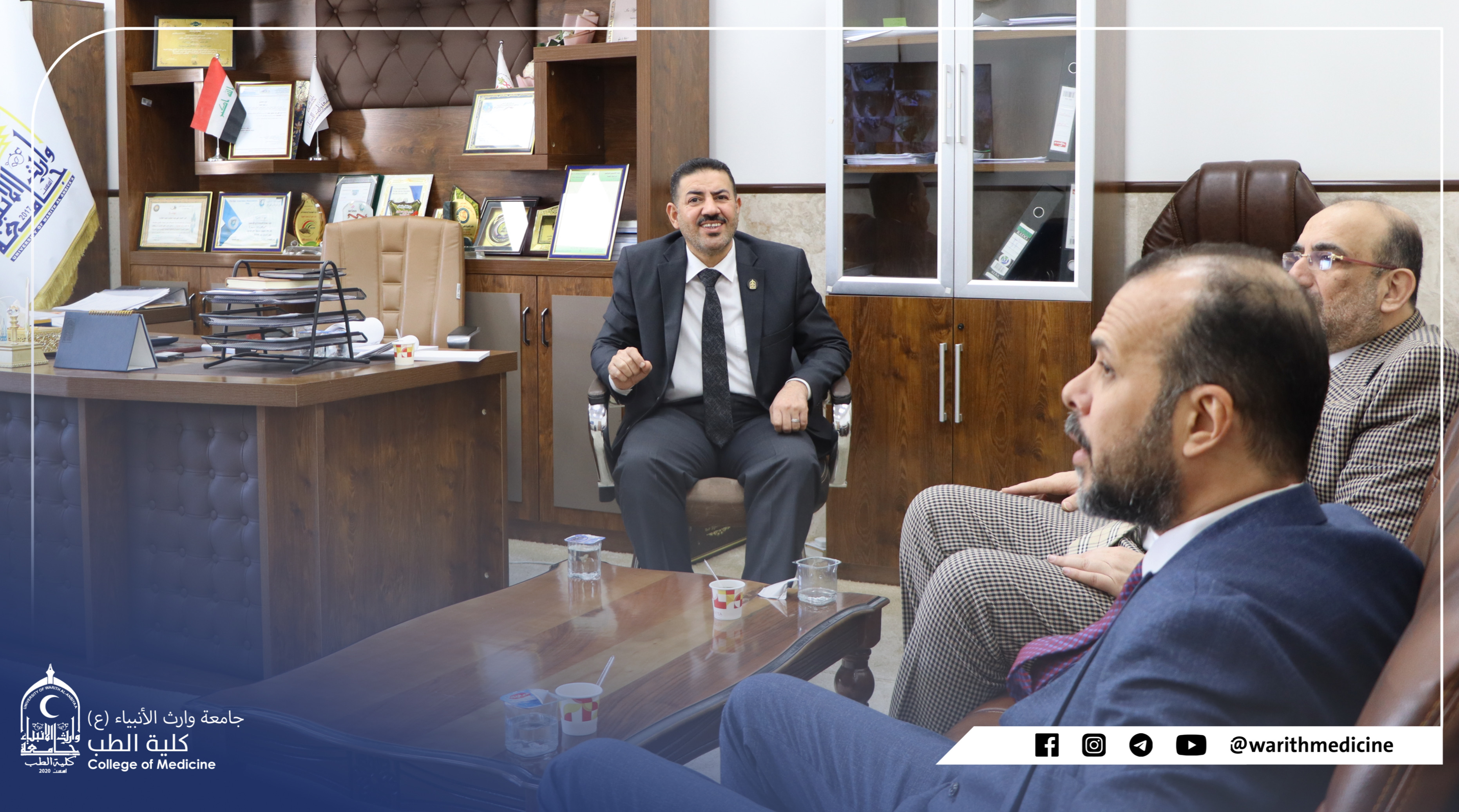 The Dean of the Faculty of Medicine at the University of Warith al-Anbiya (peace be upon him) received Professor Dr. Ali Abd Saadoun al-Ghazi, the respected Dr. Maad Nassif Jassim, a consultant to the British Royal College, where a presentation was made about the possibility of establishing a center for emergency and disaster medicine in cooperation with the British Royal College and opening channels of cooperation between the Royal British College and the University of Warith al-Anbiya. (A) Where the delegation was briefed on the infrastructure and human resources at the university.